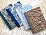the lay-flat notebooks, also known as sewn-board bindings, are lovely practical little books. they lay completely flat when you open them, so you can write easily anywhere, and there’s no gutter margin! i use 90gsm paper for the textblock and it doesn’t bleed, so these are great books for journaling. the spine and corners or fore-edge are covered in linen. contrasting decorative paper is used on the boards, with complementary coloured endpapers. as with the coptic stitch journals, i never use the same combination of linen and paper more than once, so each book is a unique creation.