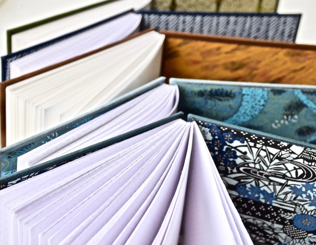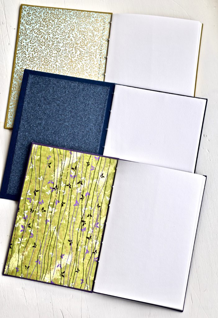 i usually make coptic stitch journals in two different sizes: a5 (21.5 x 15.5 cm) and a6 (11 x 14.5 cm), and each size may be sewn in portrait or landscape format. the textblocks are either blank or dot-grid paper. custom sizes and formats can be made on request. each journal is covered in bookcloth with an inset of decorative paper; the same paper is used for the inside paste-down. as with the lay-flat notebooks, i never use the same combination of paper and cloth more than once, so each book is unique.